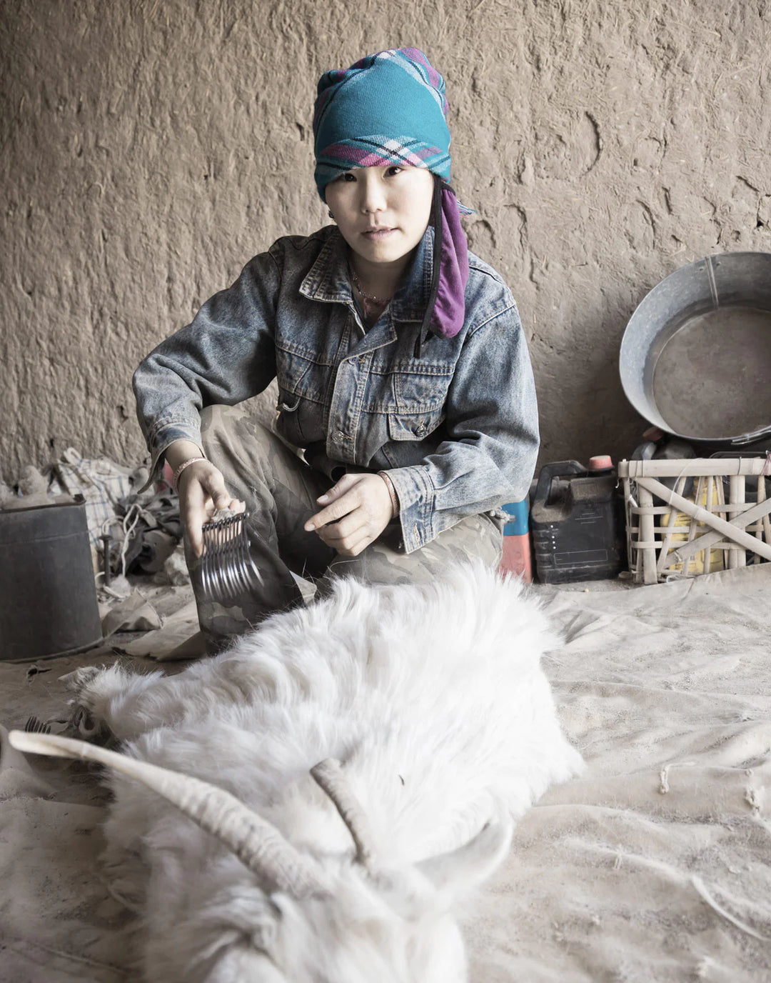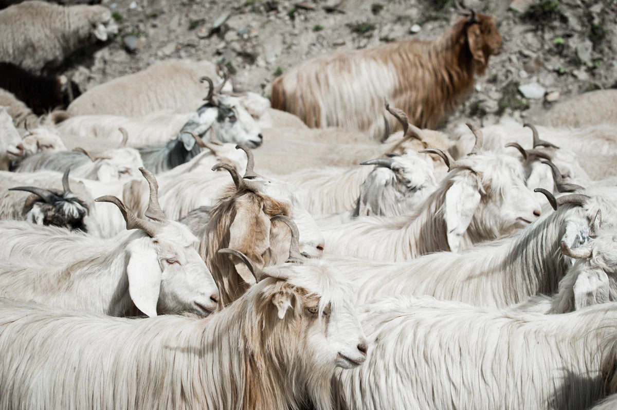 «Kashmirull kommer fra geiter. Ullen gres av manuelt med kam, en tradisjonell prosess og teknikk som er rask og helt smertefri for dyrene»