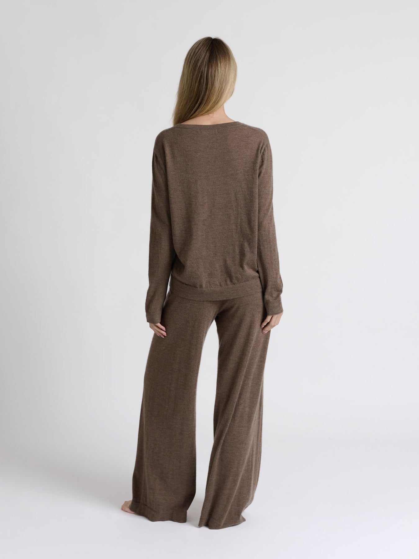 Lett og myk basegenser i 100% kashmir. Genseren er i vår fineste kashmirkvalitet, 16 gg, med små tette masker som gir en utrolig handfeel og komfort rett mot huden. Genseren har v-hals, er romslig og laidback. Aina har enkle finisher på hals, ermer og livet, som gjør den både tidløs og anvendelig. En genser du kan ha i åresvis, som aldri går av moten, men som blir en ekte garderobefavoritt. Styles gjerne i sett med Air pants, som er i samme farge og strikk. Ellers tucker vi denne kashmirgenseren i bukselinningen eller skjørtlinningen, for en kul og relaxed look.