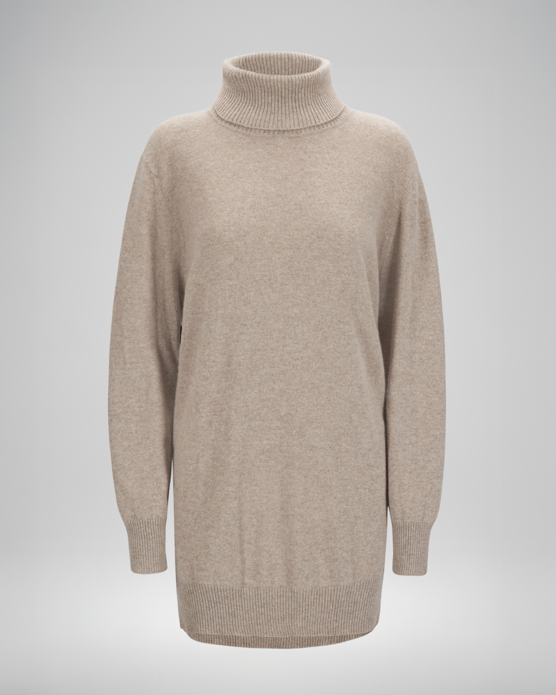 Lang høyhalset kashmirgenser i 100% ren kasjmirull. Norsk design fra Kashmina. Farge: Toast